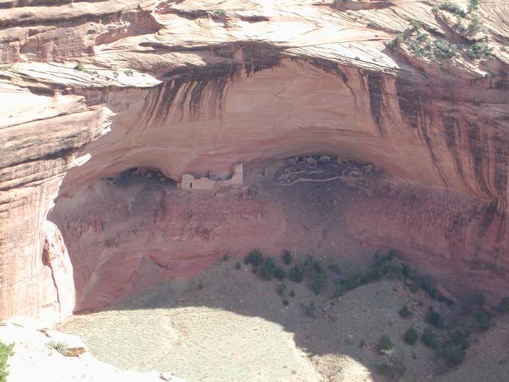 | 17 April 2002, Canyon de Chelly National Monument, Navajo Nation: We are living on the Rez now, subject to local laws and customs. Alcohol forbidden by federal law, no photography of local people, homes, land or their animals without permission. No hiking without a native guide. Canyon de Chelly figures prominently in recent Navajo history, but these ruins all predate the current Navajo owners. This is the 700 year old Puebloan village called Mummy Cave Ruin, viewed from about 1000' above. |