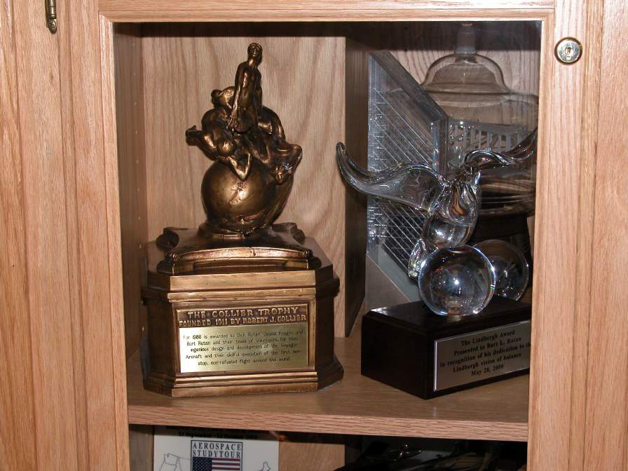 | 14 April 2004, Mojave, CA: In the office of Scaled Composites, the aircraft company of Burt Rutan, you can find the Collier Trophy and the Lindberg Trophy and just about every other major award in aviation crammed in a tiny cupboard. This is where history will be made later this year with a private space venture pictured below (White Knight mated with Spaceship One). |